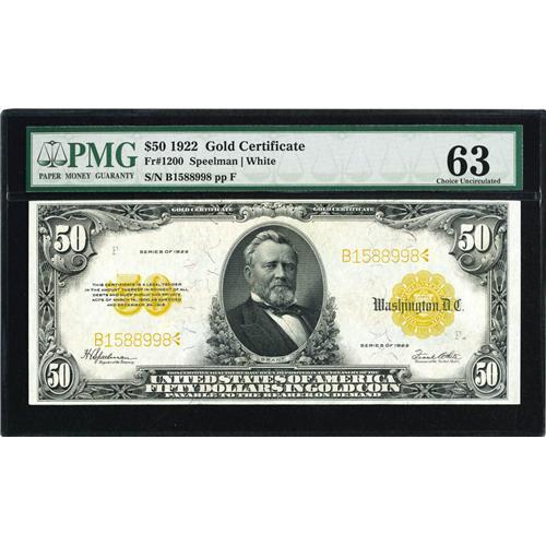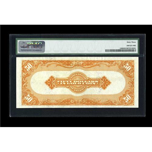 <B>Fr. 1200 $50 1922 Gold Certificate PMG Choice Uncirculated 63.</B></I> Another old friend returns, this one from our CAA May 2001 sale. The Gold Back is well centered and exquisitely printed with very bright inking. Perhaps lowered from the Very Choice designation due to a tight top margin. Still a desirable example worthy of your attention.