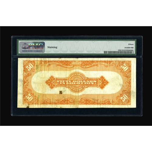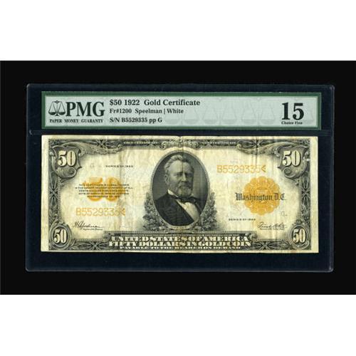 <B>Fr. 1200 $50 1922 Gold Certificate PMG Choice Fine 15.</B></I> This moderately circulated issue boasts bright yellow printed details. The third party holder notes "Staining," though the spots are confined to the back and do not detract much at all.<BR><BR><b>Shipping:</b> Coins & Currency (<a target="_blank" href="http://www.heritageauctions.com/common/shipping.php">view shipping information</a>)
