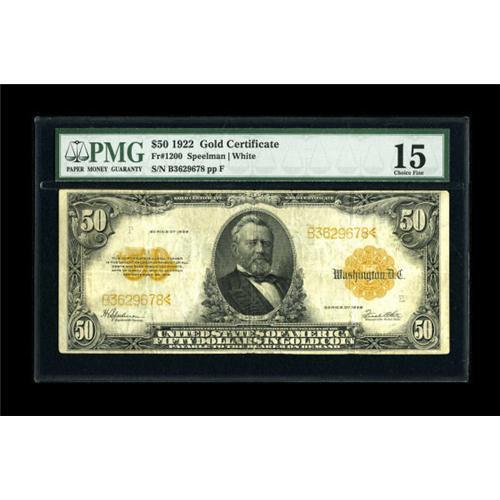 <B>Fr. 1200 $50 1922 Gold Certificate PMG Choice Fine 15.</B></I> This $50 Gold has original paper surfaces.<BR><BR><b>Shipping:</b> Coins & Currency (<a target="_blank" href="http://www.heritageauctions.com/common/shipping.php">view shipping information</a>)