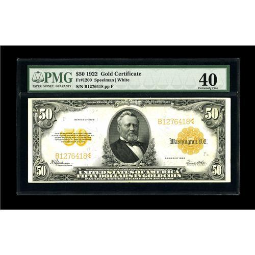 <B>Fr. 1200 $50 1922 Gold Certificate PMG Extremely Fine 40.</B></I> This is a beautifully bright note, with good margins and super color. Remaining fold lines are visible when held up to a bright light source.<BR><BR><b>Shipping:</b> Coin/Currency (<a target="_blank" href="http://www.heritageauctions.com/common/shipping.php">view shipping information</a>)