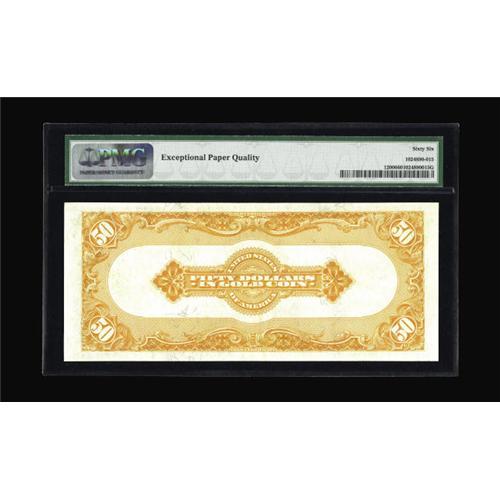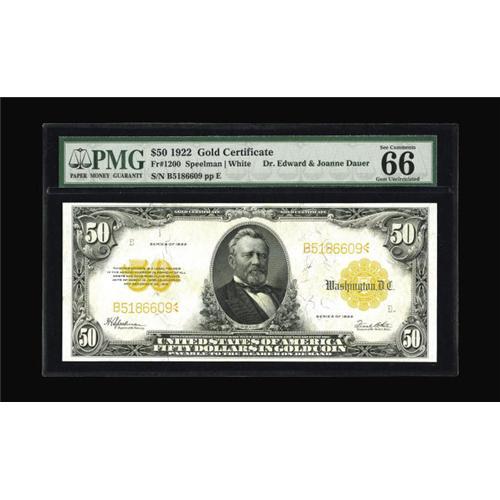 <B>Fr. 1200 $50 1922 Gold Certificate PMG Gem Uncirculated 66 EPQ.</B></I> Through the holder, we cannot discern any detail that would hold this Fifty Dollar Gold note from the full Superb Gem New category, except for the fact that whether or not the amount of top margin at the left end of the face is commensurate with 67 comes down to a close judgement call. To boot, the third-party service has awarded this EPQ designation to this Dauer Collection note, which is plated in Dr. Edward and Joanne Dauer's illustrated book on page 342.<BR><I>From The Dr. Edward and Joanne Dauer Collection</B></I>