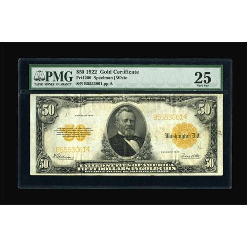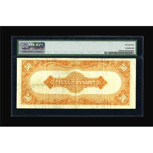 <B>Fr. 1200 $50 1922 Gold Certificate PMG Very Fine 25.</B></I> Broad margins and wholly original paper are noted on this $50.<BR><BR><b>Shipping:</b> Coins & Currency (<a target="_blank" href="http://www.heritageauctions.com/common/shipping.php">view shipping information</a>)