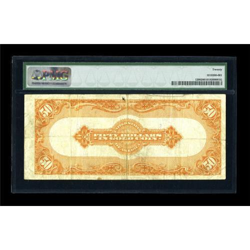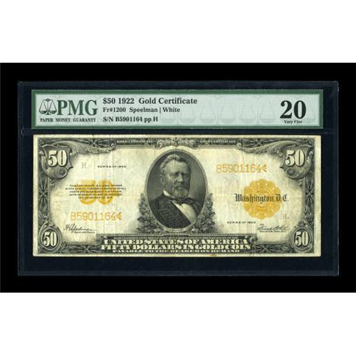 <B>Fr. 1200 $50 1922 Gold Certificate PMG Very Fine 20.</B></I> <BR> A couple of small spots are found on the back on this colorful note. Still a majestic $50 Gold note.<BR><BR><b>Shipping:</b> Coins & Currency (<a target="_blank" href="http://www.heritageauctions.com/common/shipping.php">view shipping information</a>)