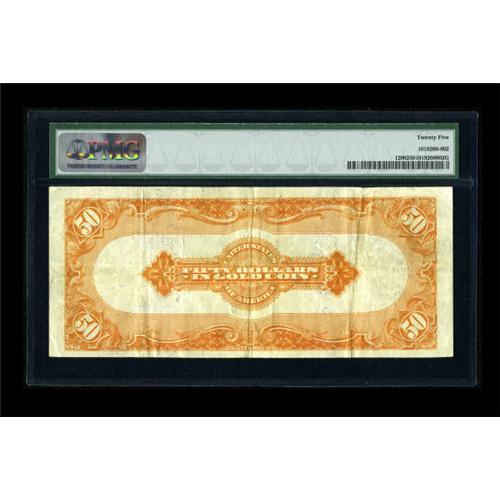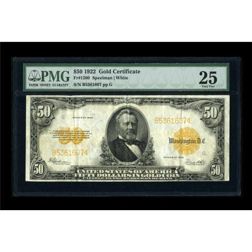 <B>Fr. 1200 $50 1922 Gold Certificate PMG Very Fine 25.</B></I> The paper is bright and the overprints vibrant on this ever popular design type.<BR><BR><b>Shipping:</b> Coins & Currency (<a target="_blank" href="http://www.heritageauctions.com/common/shipping.php">view shipping information</a>)