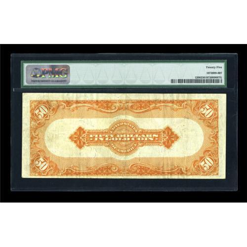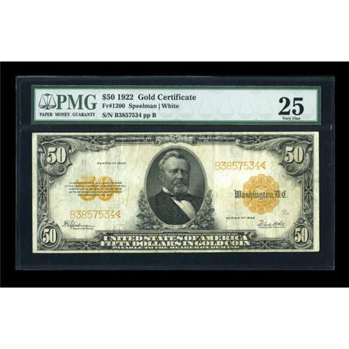 <B>Fr. 1200 $50 1922 Gold Certificate PMG Very Fine 25.</B></I> This exquisite $50 spent very little time in circulation, just enough to encounter a few folds and a minimal amount of soiling. The overprint and back design are as bold as one could hope for in the grade.<BR><BR><b>Shipping:</b> Coins & Currency (<a target="_blank" href="http://www.heritageauctions.com/common/shipping.php">view shipping information</a>)