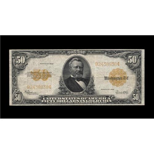 <B>Fr. 1200 $50 1922 Gold Certificate Very Fine.</B></I> Terrific color and nice natural paper surfaces bring strong visual allure to this mid-grade Gold $50.