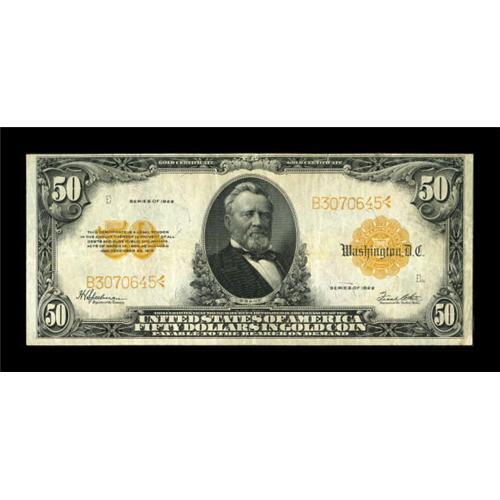 <B>Fr. 1200 $50 1922 Gold Certificate Very Fine.</B></I> There is a short edge tear at the top, which is a shame since this $50 Gold is problem-free in all other respects. These are becoming difficult to find. <BR><BR><b>Shipping:</b> Coins & Currency (<a target="_blank" href="http://www.heritageauctions.com/common/shipping.php">view shipping information</a>)