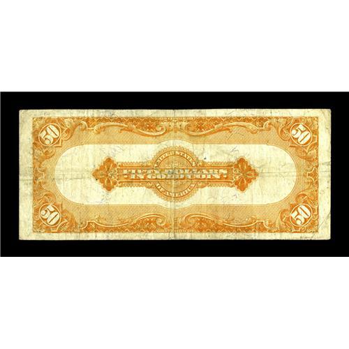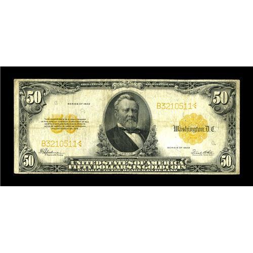 <B>Fr. 1200 $50 1922 Gold Certificate Very Good-Fine.</B></I> Numerous pinholes are seen on this large size Gold Note that is very bright.<BR><BR><b>Shipping:</b> Coin/Currency (<a target="_blank" href="http://www.heritageauctions.com/common/shipping.php">view shipping information</a>)