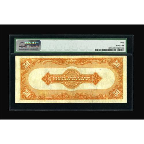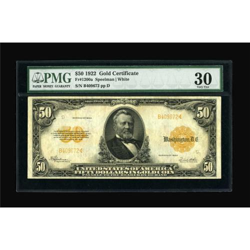 <B>Fr. 1200a $50 1922 Gold Certificate PMG Very Fine 30.</B></I> All Fr. 1200a's are Mules, with this note having back plate number 1 positioned at lower right of center up next to the finely detailed scroll work. Fr. 1200a's were issued before Fr. 1200's, and 1200's outnumber 1200a's by more than five to one in the census. Fr. 1200a's were not added to the Friedberg reference until the 1992 13th edition. This example has a deep orange back and healthy edges.<B><BR></B></I><I>From The John Ameen Collection</B></I><BR><BR><b>Shipping:</b> Coins & Currency (<a target="_blank" href="http://www.heritageauctions.com/common/shipping.php">view shipping information</a>)