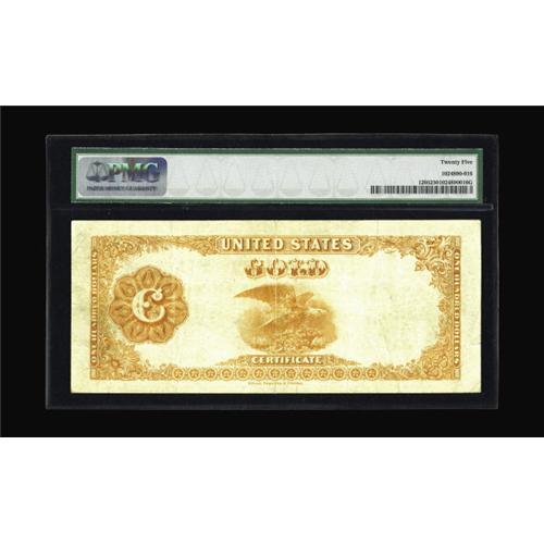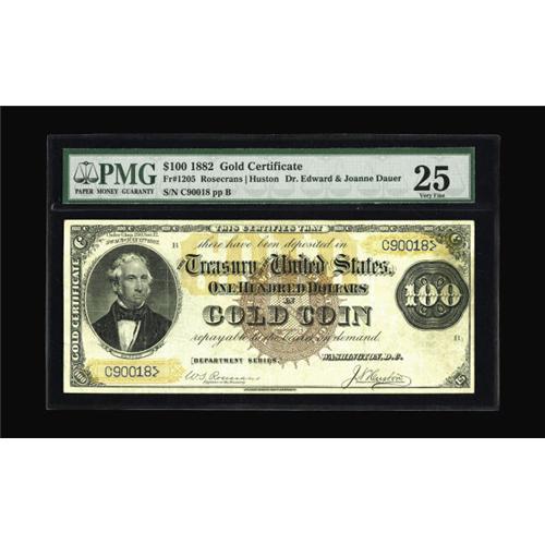 <B>Fr. 1205 $100 1882 Gold Certificate PMG Very Fine 25.</B></I> Last on the market when the Herman Halperin Collection sold in 1993, this Large Brown Seal Hundred is one of only seven examples known. Three of the seven are permanently impounded in government collections. Brown Seal Hundreds are a one-number type, and the four 1205's in collectors hands represent the only available examples. This piece is very nicely margined, with good color on both sides. It resides in a PMG comment-free holder and compares very favorably with the highest grade note in the census, which is only a half grade above this example. The note is photographed on page 344 of the Dauer book, which also includes this short bio of Thomas Benton, who appears on the note, "Thomas Benton was elected as a senator from Missouri in 1821. He believed in the importance of using Gold and Silver to purchase public land in order to discourage speculation. This idea was legalized by President Jackson in 1836 after Congress defeated his resolution. This resulted in discouragement of land speculation and helped settlers develop the west." With a scant four pieces available to collectors combined with its being a solid mid-grade example, this piece could easily reach and quite possibly exceed...<BR><I>From The Dr. Edward and Joanne Dauer Collection</B></I>