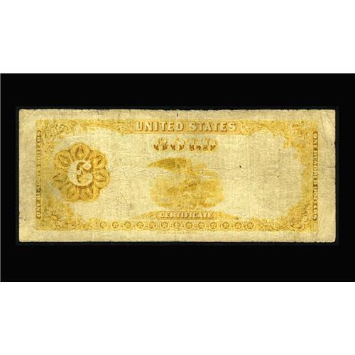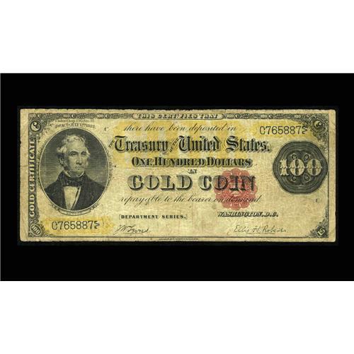 <B>Fr. 1206 $100 1882 Gold Certificate Very Good.</B></I> The note has a few small pinholes and a little roughness at the edges as one would expect for the grade, but it has retained good color. This is a scarce number, with only about 40 examples known in all grades combined.