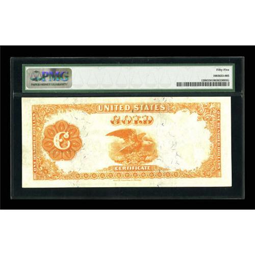 <B>Fr. 1208 $100 1882 Gold Certificate PMG About Uncirculated 55.</B></I> This is one of only two examples known at this grade level for this rare Friedberg number, with none graded higher in any census, and the only specimen graded to date of this number in any grade by PMG. It displays vivid colors, excellent paper quality, and great eye appeal, and is nicely centered and free of any detractions. With the emphasis in today's marketplace for rarity combined with quality, expect this outstanding Gold Certificate to easily reach and quite possibly exceed our likely conservative estimate of... <BR><BR><b>Shipping:</b> Coins & Currency (<a target="_blank" href="http://www.heritageauctions.com/common/shipping.php">view shipping information</a>)