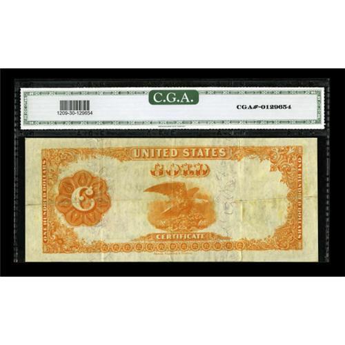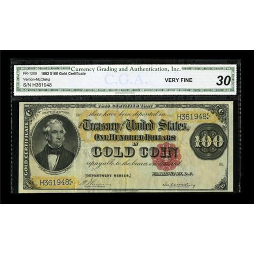 <B>Fr. 1209 $100 1882 Gold Certificate CGA Very Fine 30.</B></I> The color and overall appearance are excellent despite the heavy folds that account for the grade.<BR><BR><b>Shipping:</b> Coins & Currency (<a target="_blank" href="http://www.heritageauctions.com/common/shipping.php">view shipping information</a>)