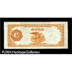 Fr. 1209 $100 1882 Gold Certificate Superb Gem New. <B>Fr. 1209 $100 1882 Gold Certificate Superb Gem New.</B></I> Fr. 1209 is a rather scarce number in all grades, with about 45 examples known to exist. This, however, is the only uncirculated note. Its first appearance on the market was in our January 2001 sale, and at that sale, it realized $16,500. The note is hugely margined, perfectly bright on both sides and absolutely uncirculated. It even exhibits its full original embossing, something virtually unknown for this type. Anyone attempting to assemble the finest set of Gold Certificates simply must have this piece, as nothing comparable to it exists. <BR><BR><B>Important notice:</B> Heritage usually auctions material at the rate of 200-250 lots per hour. On some occasions eBay Live bid software or the Internet may not be able to keep up with the pace of the auction. We recommend placing a realistic absentee bid now as insurance to avoid disappointment. Occasionally the auctioneer may eliminate or reject an eBay Live bid, and the auctioneer may also reopen a lot after the close of the eBay live bidding (usually because we missed an audience bid), and may reject your bid even if it shows you as the winning bidder. By bidding via eBay Live, you agree that Heritage may award the lot to another bidder at its sole discretion under the circumstances described above or any other reasonable circumstances. Since eBay bids are not shown to us until we open the lot on the floor, we treat those bids just like floor bids. In most cases the floor responds before the eBay bid is presented to us, due to Internet lag time, so for consistency we have made it a policy that floor bids are always considered first over tie eBay live bids. Also please note that all Heritage lots purchased through eBay Live carry a 20% Buyer's Premium. Please make sure you read the Terms and Conditions before you bid. This lot is being auctioned in conjunction with a live floor auction by Heritage Galleries & Auctioneers. All final auction and invoice information will be supplied by Heritage Galleries & Auctioneers, and all other information should be considered preliminary. Lot:17867