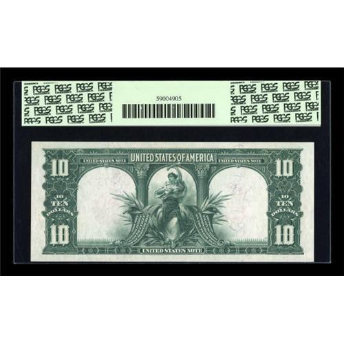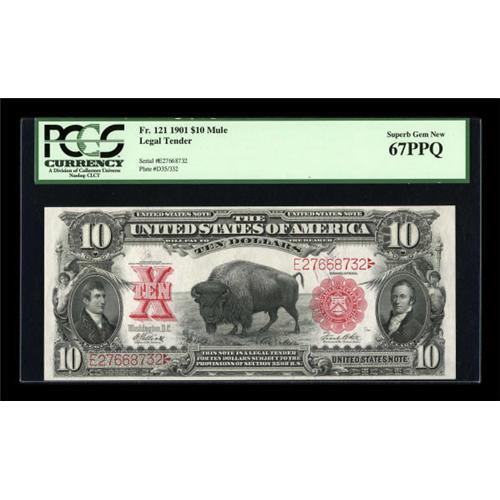 <B>Fr. 121 $10 1901 Mule Legal Tender PCGS Superb Gem New 67PPQ.</B></I> A glorious Bison that exhibits eye popping color and strong embossing. This could perhaps be the finest Mule known. Population reports show that PMG has graded four notes at this level, but do not differentiate between the types. Huge even margins and great centering frame this example nicely.<BR><BR><b>Shipping:</b> Coins & Currency (<a target="_blank" href="http://www.heritageauctions.com/common/shipping.php">view shipping information</a>)