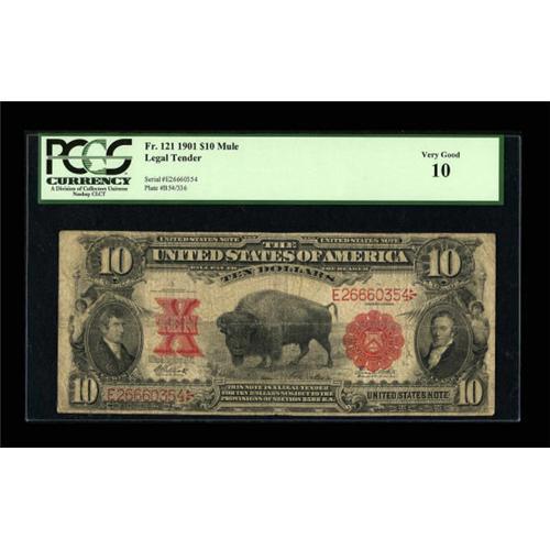 <B>Fr. 121 $10 1901 Mule Legal Tender PMG Very Good 10.</B></I> The red overprint is still very vivid for the grade on this Mule example.<BR><I>From The Kansas City Collection.</B></I><BR><BR><b>Shipping:</b> Coins & Currency (<a target="_blank" href="http://www.heritageauctions.com/common/shipping.php">view shipping information</a>)