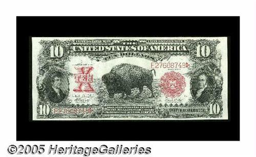 <B>Fr. 121 $10 1901 Legal Tender Superb Gem New.</B></I> Anyone who has become reasonably well acquainted with Large size currency knows that the incredibly popular Bison note, while steadily increasing in value over the past ten years, is not a particularly difficult issue in XF to Choice New condition. Its beautiful design inspires tremendous crossover appeal, not only to all levels of currency collectors, but also to coin enthusiasts and history buffs in general. However, the availability of true high grade survivors is surprisingly limited. The exceptional $10 Bison note we now offer is one such example. One can immediately tell from the bold embossing on the back and consistently rich colors that this note is a cut above what is normally offered. Jim O'Neal's Bison is one of the very finest examples of this type that we have offered, and we have offered a lot of Gems. The margins are nothing short of incredible, and the note has every possible technical merit, including pronounced deep, original embossing. A super type note.