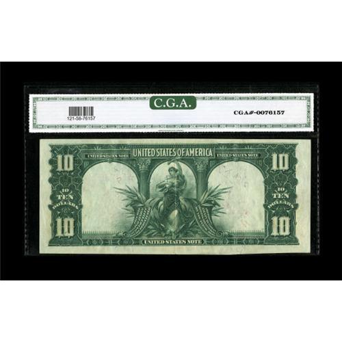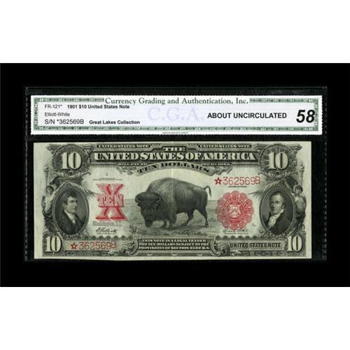 <B>Fr. 121 $10 1901 Mule Legal Tender Star Note CGA About Uncirculated 58.</B></I> A center fold is noted on this well embossed and attractive Star issue. No finer Fr. 121 Star has been offered at auction since 1998. This piece last sold in 2005 for $8,625. In a market looking for quality large size notes, it's possible this piece will exceed...<BR><BR><b>Shipping:</b> Coins & Currency (<a target="_blank" href="http://www.heritageauctions.com/common/shipping.php">view shipping information</a>)