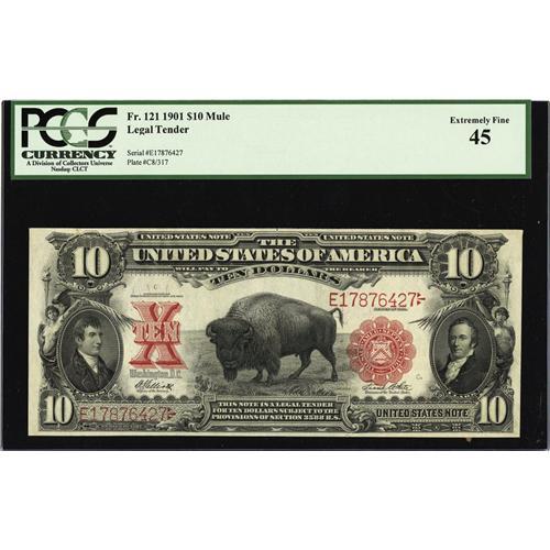 <B>Fr. 121 $10 1901 Mule Legal Tender PCGS Extremely Fine 45.</B></I> Nice margins surround this vividly colored Bison on which two light vertical folds are seen.
