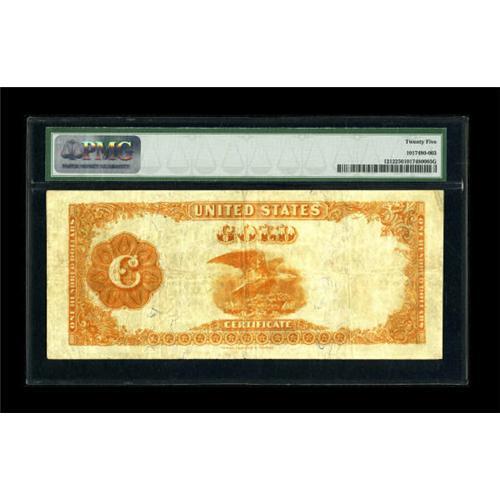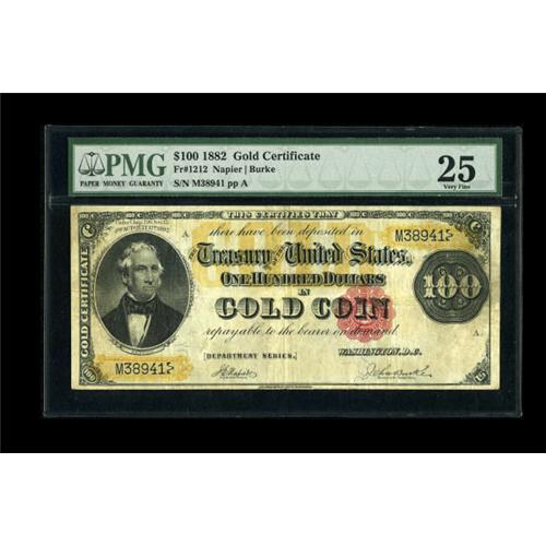 <B>Fr. 1212 $100 1882 Gold Certificate PMG Very Fine 25.</B></I> About forty examples are known in all grades combined for this number, with higher grade pieces in even shorter supply. PMG has graded just five specimens, with the highest coming in grading only Very Fine 35. This bright note displays even margins, good color, and traces of the original embossing.<BR><BR><b>Shipping:</b> Coins & Currency (<a target="_blank" href="http://www.heritageauctions.com/common/shipping.php">view shipping information</a>)