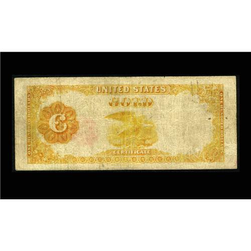 <B>Fr. 1213 $100 1882 Gold Certificate Fine.</B></I> There is a paper-clip rust stain from the top edge into Benton's forehead, and the note has about a dozen pinholes and two or three slightly larger holes. None of them are obtrusive, and it's not at all a bad-looking example of this much scarcer Friedberg number. We know of only about three dozen pieces in all grades combined.