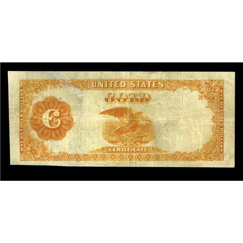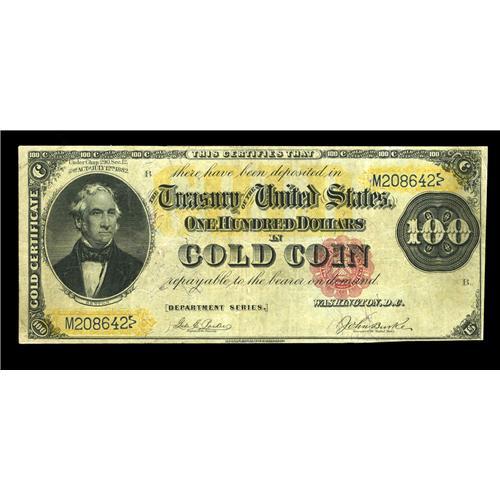 <B>Fr. 1213 $100 1882 Gold Certificate Very Fine.</B></I> This is quite a scarce number, with just over 30 examples listed in the census in all grades combined. This otherwise ideal example for the grade has been trimmed a bit close at lower right but should still sell for a minimum of...
