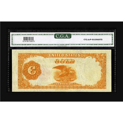 <B>Fr. 1214 $100 1882 Gold Certificate CGA About Uncirculated 58.</B></I> A note that within the holder has two folds visible. Today the grading companies might call this AU one day and XF the next. Definitely a bright piece with some embossing present. This Friedberg is quite elusive in the higher grades.<BR><BR><b>Shipping:</b> Coin/Currency (<a target="_blank" href="http://www.heritageauctions.com/common/shipping.php">view shipping information</a>)