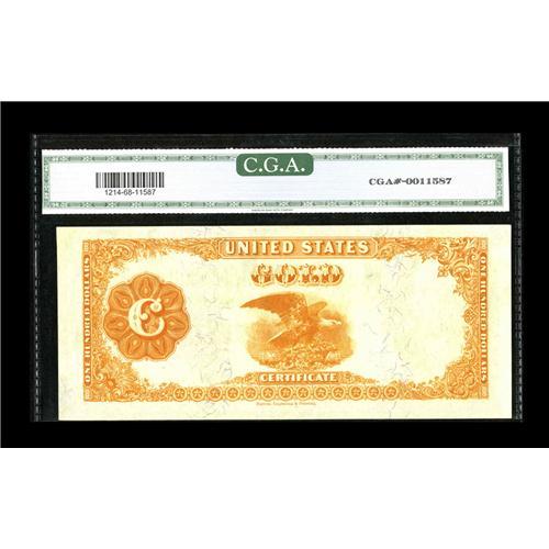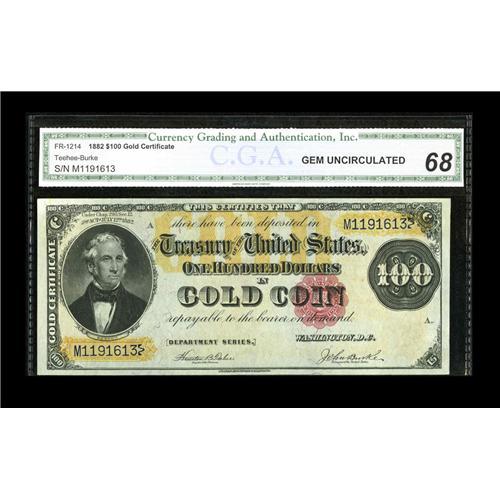 <B>Fr. 1214 $100 1882 Gold Certificate CGA Gem Uncirculated 68.</B></I> A hugely margined example with ideal color and spectacular eye appeal. Attempting to re-grade third party notes through their holders can be challenging at best. However, this piece certainly appears to us to have earned every point of its lofty 68 designation. The Green Sheet does not list this number higher than 65, but this is a note that will help fill in the blank for the 67 column.