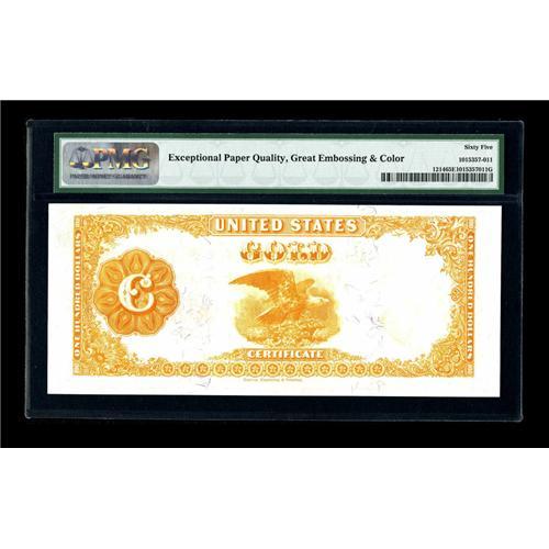 <B>Fr. 1214 $100 1882 Gold Certificate PMG Gem Uncirculated 65 EPQ.</B></I> A very pretty note with lots of positive qualifiers. PMG has commented "Exceptional Paper Quality, Great Embossing & Color." This beauty is just a hair of margin away from the Superb grade.<BR><BR><b>Shipping:</b> Coins & Currency (<a target="_blank" href="http://www.heritageauctions.com/common/shipping.php">view shipping information</a>)