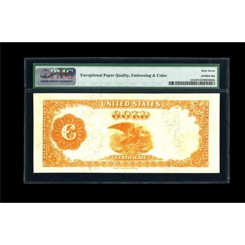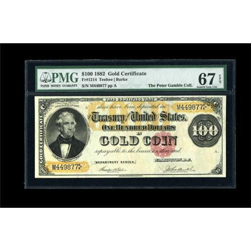 <B>Fr. 1214 $100 1882 Gold Certificate PMG Superb Gem Unc 67 EPQ.</B></I> The highest PMG graded Fr. 1214 to reach the auction block had been a 66, which sold last June for $36,800. This 67 will very likely blow far past that number. It is a simply magnificent piece of paper with brilliant color, broad margins, and tremendous eye appeal. The embossing is incredibly pronounced and easily seen through the third party holder by even the untrained eye. Along with the Superb 67 grade, PMG has added the comment "Exceptional Paper Quality, Embossing & Color". A note that is fit for the very finest of collections.<BR><I>From The Peter Gamble Collection.</B></I><BR><BR><b>Shipping:</b> Coins & Currency (<a target="_blank" href="http://www.heritageauctions.com/common/shipping.php">view shipping information</a>)