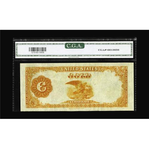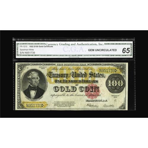 <B>Fr. 1215 $100 1922 Gold Certificate CGA Gem Uncirculated 65.</B></I> Bold inks on white paper highlight this $100 Gold that posseses a vibrant orange back. The margins are also ample.