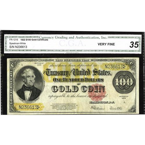 <B>Fr. 1215 $100 1922 Gold Certificate CGA Very Fine 35.</B></I> The ink colors are as bold on this note as they would be on a higher grade example. It's a well centered piece on both sides, and it has paper originality that shows through the third-party holder.