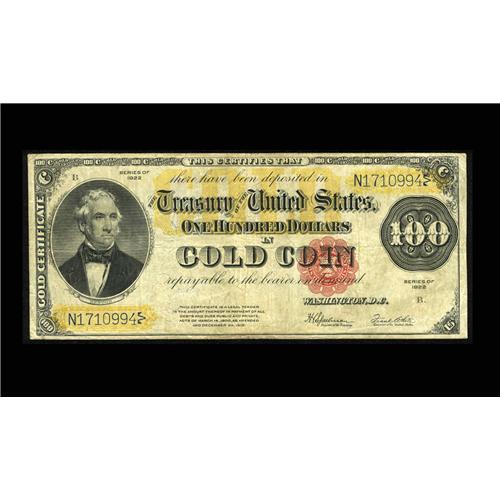 <B>Fr. 1215 $100 1922 Gold Certificate Fine-Very Fine.</B></I> This circulated Gold Hundred is absolutely problem-free for the grade, with bright inks and colors for the grade and excellent paper quality for a moderately circulated note.