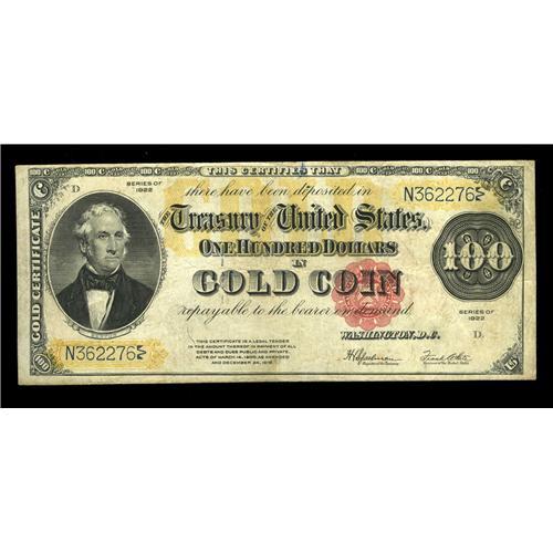 Fr. 1215 $100 1922 Gold Certificate Fine-Very Fine. Lot Fr. 1215 $100 1922 Gold Certificate Fine-Ver
