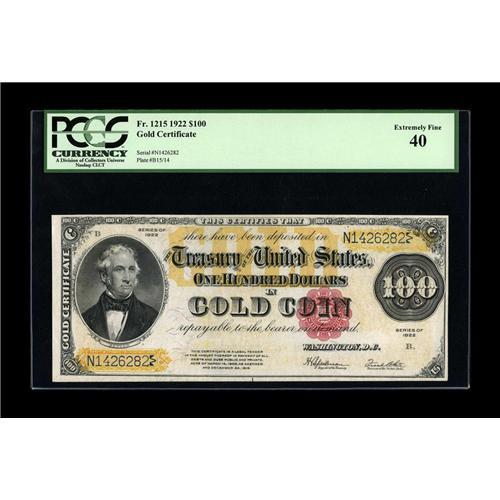 <B>Fr. 1215 $100 1922 Gold Certificate PCGS Extremely Fine 40.</B></I> A most handsome example of a "C-note." It is wholly without the circulation soil one would expect for the grade. Bright and pretty.<BR><BR><b>Shipping:</b> Coin/Currency (<a target="_blank" href="http://www.heritageauctions.com/common/shipping.php">view shipping information</a>)