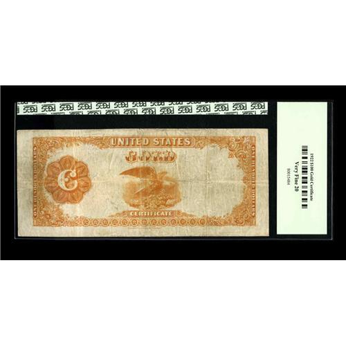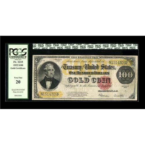 <B>Fr. 1215 $100 1922 Gold Certificate PCGS Very Fine 20.</B></I> The orange back on this C-note is quite vibrant. Fortunately for the collecting community we have a number of these notes available.