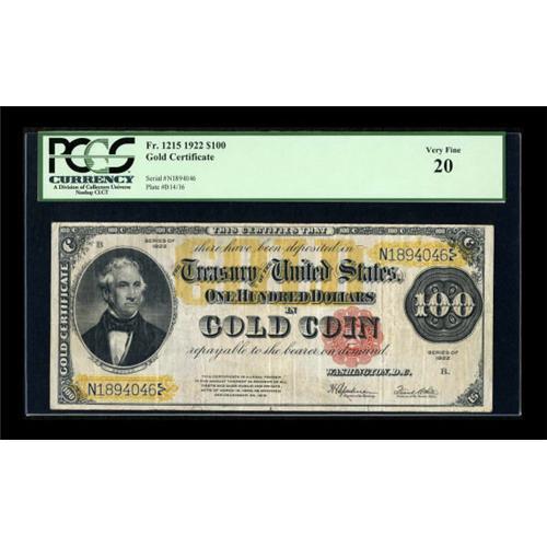 <B>Fr. 1215 $100 1922 Gold Certificate PCGS Very Fine 20.</B></I> Tremendous color for the grade with the gold overprint on the front as well as the full orange back color at the level of brilliance that one would expect from an Uncirculated note. A very high-end example for the grade.<BR><BR><b>Shipping:</b> Coins & Currency (<a target="_blank" href="http://www.heritageauctions.com/common/shipping.php">view shipping information</a>)