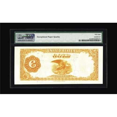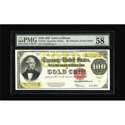 <B>Fr. 1215 $100 1922 Gold Certificate PMG Choice About Unc 58 EPQ.</B></I> The most common of the Hundred Dollar Gold Certificates by a wide margin, and consequently the most affordable example of the type. Of the 400-odd Fr. 1215's known, quite a few are technically higher grade than this Choice About Uncirculated piece, but not a whole lot could have better color and more eye appeal. This note gives the appearance of a Superb Gem, with its broad margins and razor-sharp print quality. It's photographed on page 344 of the Dauer book.<BR><I>From The Dr. Edward and Joanne Dauer Collection</B></I>