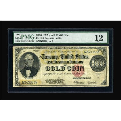 <B>Fr. 1215 $100 1922 Gold Certificate PMG Fine 12.</B></I> Hundred Dollar Gold Certificates are as popular as ever.<BR><BR><b>Shipping:</b> Coins & Currency (<a target="_blank" href="http://www.heritageauctions.com/common/shipping.php">view shipping information</a>)