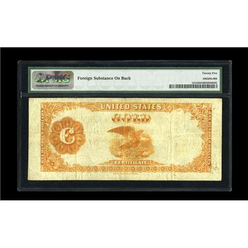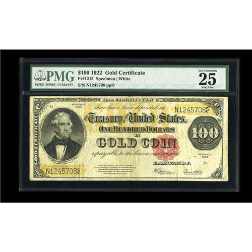 <B>Fr. 1215 $100 1922 Gold Certificate PMG Very Fine 25.</B></I> Decently margined, evenly circulated Gold C-Note. PMG notes: "Foreign Substance On Back." That is certainly possible, but it appears to us to be domestic glue.