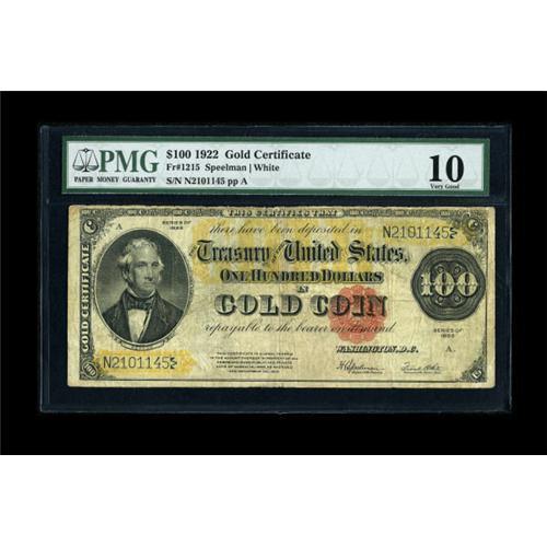 <B>Fr. 1215 $100 1922 Gold Certificate PMG Very Good 10.</B></I> This note has more eye appeal and color than the grade suggests.<BR><BR><b>Shipping:</b> Coins & Currency (<a target="_blank" href="http://www.heritageauctions.com/common/shipping.php">view shipping information</a>)