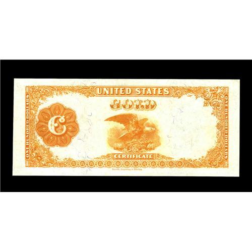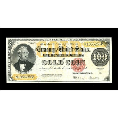 <B>Fr. 1215 $100 1922 Gold Certificate Superb Gem New.</B></I> One of the nicest Hundred Dollar Gold Certificates that we have ever laid eyes on. It has spectacular deep, original embossing, boardwalk margins all around, simply perfect color of the inks and paper and not a hint of a counting mark, pinch or handle. If you are seeking the ultimate quality in type notes, this is the one.