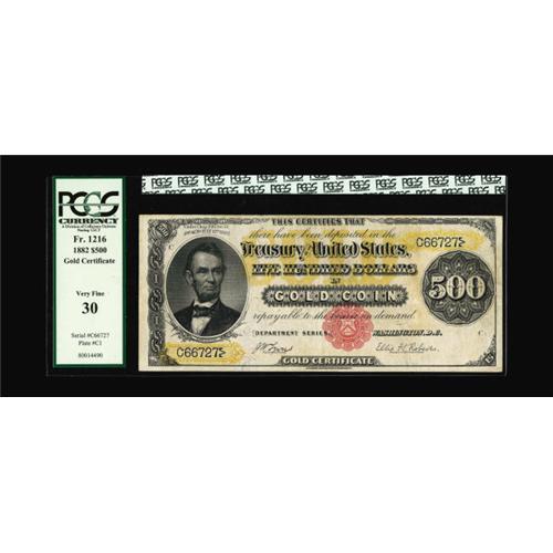 <B>Fr. 1216 $500 1882 Gold Certificate PCGS Very Fine 30.</B></I> Nearly one of every five survivors known of this high denomination Gold Certificate is permanently impounded in institutional collections. This leaves about 20 pieces available for collectors all of which are circulated and while the best representatives available for this issue are a trio of EF's, it is even more notable that not a single uncirculated specimen is known for this Small Red Seal type which includes four Friedberg numbers. While graded VF, this note is certainly in the running for the sake of its eye appeal. A total of four vertical folds and a corner fold are noted, suffice to say this note was graded under the strictest of standards. The color remains perfectly bright both front and back and the paper shows relatively little soil considering the circulated grade.