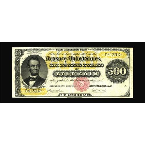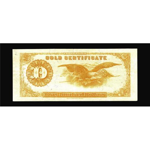 <B>Fr. 1216b $500 1882 Gold Certificate Extremely Fine-About New.</B></I> Though the number of extant pieces for this issue totals about forty, it is very interesting to note that not a single note is known in an uncirculated state of preservation. Moreover, only two AU's have been reported per the census. When discussing the merits of this note, we must note that the piece appears more About New than it does Extremely Fine. The colors remain bright and bold and the paper appears wholly original. A small segment of the top margin is a bit soft, but attests to its originality.<BR><I>From The Plymouth Rock Collection</B></I>