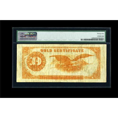 <B>Fr. 1216b $500 1882 Gold Certificate PMG Very Fine 25.</B></I> Track & Price does not report a single Fr. 1216b above the low AU grade for either its auction results or its complete census. This problem-free high-denomination Gold Certificate has clearly original paper surfaces, and far better ink colors than one would expect for the 25 grade. Just about fifty examples of this number are known, and this solid VF ranks well up in the census. <BR><I>From The Peter Gamble Collection.</B></I><BR><BR><b>Shipping:</b> Coins & Currency (<a target="_blank" href="http://www.heritageauctions.com/common/shipping.php">view shipping information</a>)