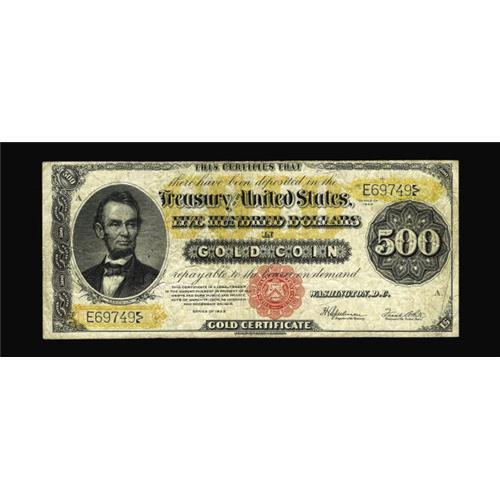 <B>Fr. 1217 $500 1922 Gold Certificate Choice Fine.</B></I> Only about 50 serial numbers are known of this one-number type with this note having escaped the census takers so far. This D-note has original paper surfaces and nice gold orange ink for the grade. These are two important criteria when searching out an example of this design. This attractive mid-grade note has a few pinholes and a small light pink spot in its lower left-hand corner, but these do not detract from the overall appeal of this majestic note.<BR><I>From The Jeffrey L. Olyan Collection, Part 1</B></I>