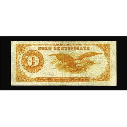 <B>Fr. 1217 $500 1922 Gold Certificate Choice Fine.</B></I> Only about 50 serial numbers are known of this one-number type with this note having escaped the census takers so far. This D-note has original paper surfaces and nice gold orange ink for the grade. These are two important criteria when searching out an example of this design. This attractive mid-grade note has a few pinholes and a small light pink spot in its lower left-hand corner, but these do not detract from the overall appeal of this majestic note.<BR><I>From The Jeffrey L. Olyan Collection, Part 1</B></I>