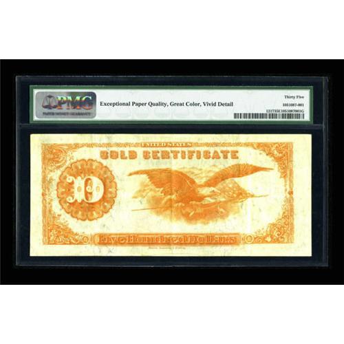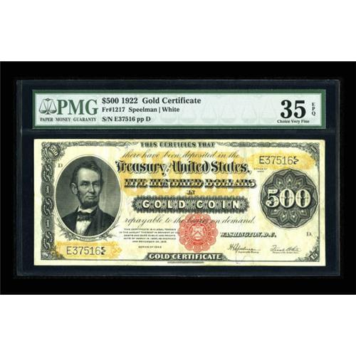 <B>Fr. 1217 $500 1922 Gold Certificate PMG Choice Very Fine 35 EPQ.</B></I> A simply spectacular example of this rare type. It is new to the census, which still numbers under fifty pieces in all grades, and easily ranks as one of the top ten highest grade specimens known. PMG has graded this piece as Choice Very Fine 35 EPQ, with the back of the holder noting "Exceptional Paper Quality, Great Color, Vivid Detail." We sold a PMG About Uncirculated 58 Fr. 1217 a year ago for $103,500, and, while this piece clearly is lower grade, the appearance through the holder of the two notes is not all that different. We can go on forever about the positive attributes of this lovely type note, but one glance at the accompanying photographs here says it all. If this gorgeous note doesn't get your pulse racing, you should probably be collecting something else. <BR><BR><b>Shipping:</b> Coins & Currency (<a target="_blank" href="http://www.heritageauctions.com/common/shipping.php">view shipping information</a>)