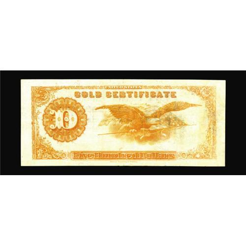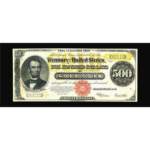 <B>Fr. 1217 $500 1922 Gold Certificate Very Fine-Extremely Fine.</B></I> This high denomination gold certificate has the look of a far higher grade when viewed from the face. The back is a bit weaker, and there is a small area at the right where it appears that a stain has been masked. The blue serial numbers, bright red seal and vibrant gold overprint on the face, along with the razor-sharp, life-like Lincoln vignette, give this note explosive eye appeal.