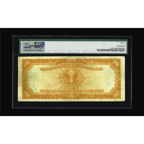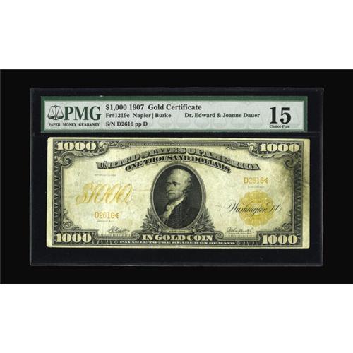 <B>Fr. 1219c $1000 1907 Gold Certificate PMG Fine 15.</B></I> This Thousand Dollar Gold Certificate is one of the rarest notes in the spectacular Dauer Collection. It is one of only four known examples, and it has been off the market since the Memphis 1985 Hickman & Oakes auction. All four known examples are well circulated. One of the four grades less than Good, and the other three are right around this grade. This note is one of an impressive array of Thousand Dollar Gold Certificates pictured on page 348 of the Dauers' American History as Seen Through Currency book. The note is very well margined, with strong color remaining. The orange back is particularly impressive, with the bold, bright color one would expect to see on a note grading 40 points higher than this. With the current popularity of low-census notes, this problem-free, attractive and extraordinarily rare example could easily cross the six-figure mark.<BR><I>From The Dr. Edward and Joanne Dauer Collection</B></I>